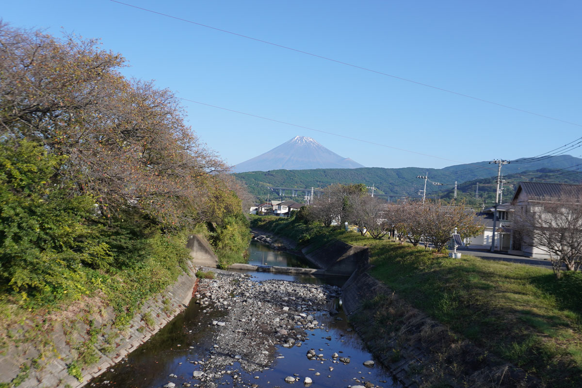 今日は曇りで時々薄日が差していますが、13.4℃と寒いです。最高気温の予想は18℃です(ウェザーニュース)。先月30日に自転車でポタリング中の一コマです。須津(すど)川に架かる向田橋の上から綺麗に富士山が見えました。