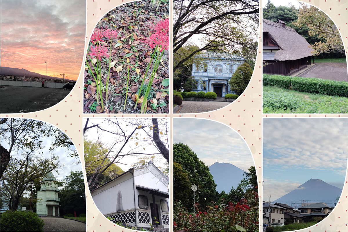 朝焼け(左上)、公園内(6枚)、帰りに見えた富士山(右下)です。